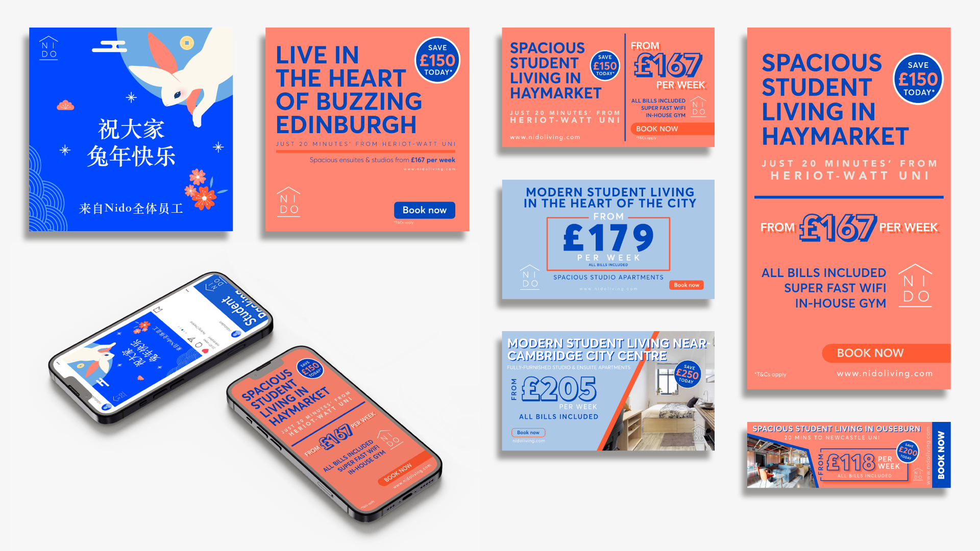 Nido Student was embarking on a critical phase of expansion, aiming to launch new accommodations and attract students in diverse European cities (including Dublin, Porto, Lisbon, Seville, Barcelona, and Copenhagen), alongside maintaining strong presence in the UK. The primary challenge was to cut through a competitive market and rapidly build brand awareness and interest for these new locations. This required a high volume of engaging, culturally resonant digital and print marketing assets—from social media to PPC banners and videos—that could effectively communicate Nido‘s value proposition across various platforms and national contexts.